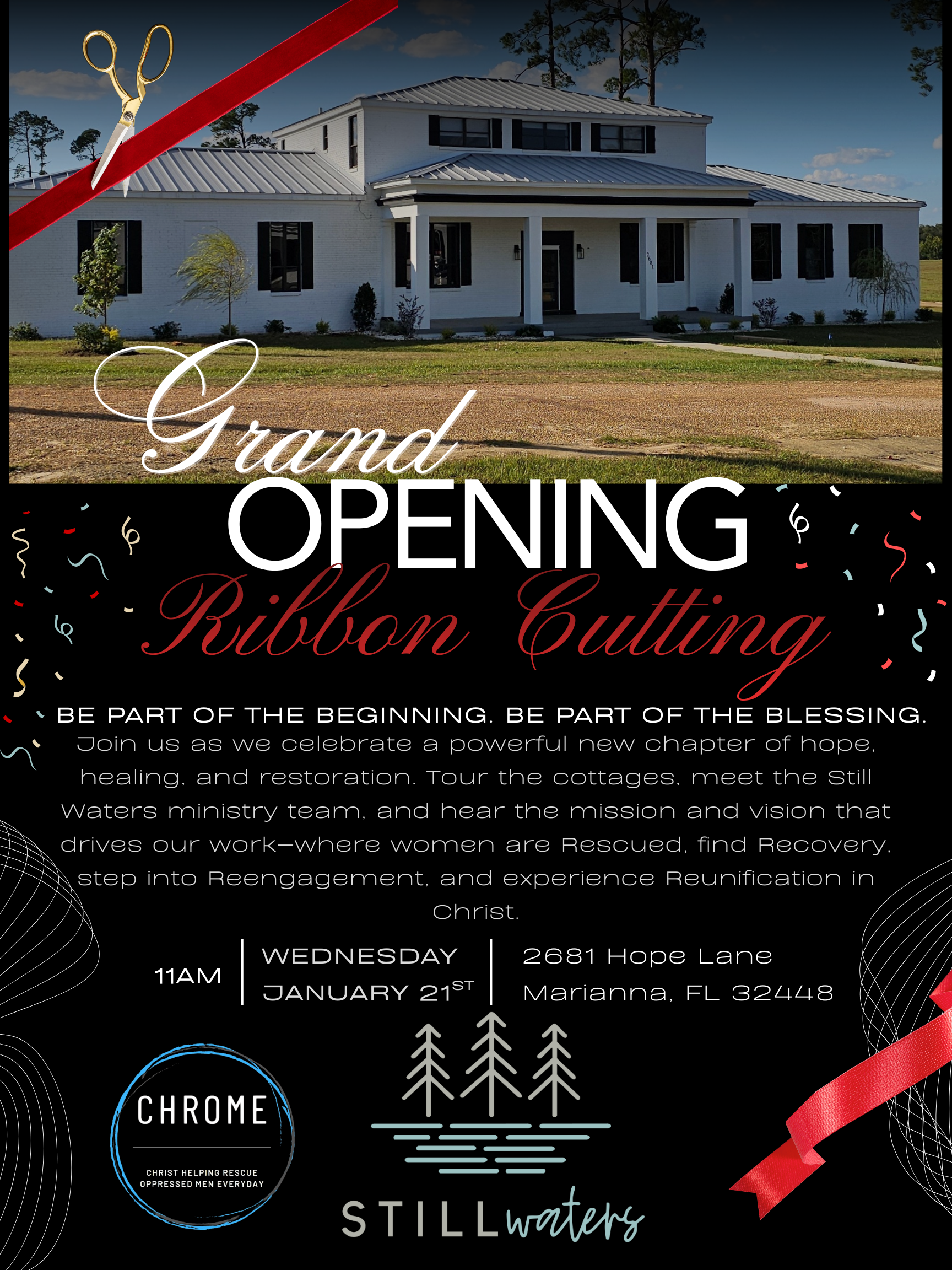 This is the Grand Opening/Ribbon Cutting for Still Waters Ministry for women which is a sister program to CHROME Retreat.  Now women will experience RESCUE, RECOVERY, RE-ENGAGEMENT, and REUNIFICATION through the love of Jesus!  We are very excited to share this moment with the community and show what God is doing here for women in the panhandle and across the United States here in Marianna, FL!